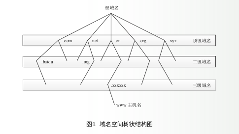域名系統能實現域名與IP地址的快速映射與轉換,為了保證網絡中域名的唯一性,域名系統采用特殊的樹狀結構以實現域名層次的劃分,每一個樹形節點都有不同的子節點,每一個域名都是從當前節點讀到根節點路徑上所有節點標記的點分順序連接的字符串,如圖1對應的域名為“www.xxxxxx.org.cn.”。其中,最后的“.”(通常省略)為根域名,“.cn”為頂級域名,“.org”為二級域名,“.xxxxxx”為三級域名,“www”為主機名。上級域名服務器中維護著其名下所有次級域名的信息,如根域名服務器中維護所有頂級域名的域名和地址信息。