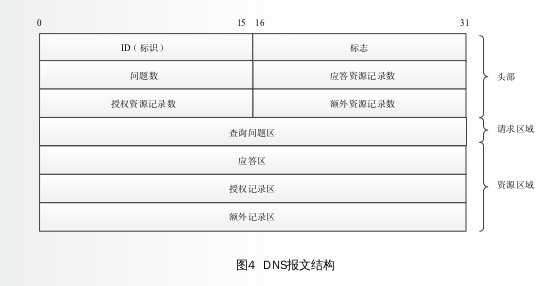 域名解析采用基于UDP協議的數據報文進行通信,且請求報文和響應報文具有相同的數據結構,如圖4所示。其中報文頭部的ID是DNS查詢應答的唯一標識,通常是隨機生成的。當客戶端發起DNS查詢時,攻擊者可以在DNS服務器應答前偽造同樣ID的響應報文對客戶端進行欺騙攻擊,其危害和緩存投毒一樣,都會使客戶端訪問到攻擊者控制的服務器,但其攻擊不如緩存中毒攻擊持久。