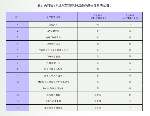 綜上,本文列舉了一些常見安全問題在內網域名系統中的安全保密風險情況,另外,還有一些老生常談的DNS服務器操作系統配置不完善、DNS軟件(Linux系統的BIND、Windows系統的DNS服務系統組件)配置不完善等風險,以及一些在內網域名系統出現概率非常低的安全保密風險,如相似域名欺騙、偽造DNS服務器、無效域名查詢攻擊等,就不再一一贅述。表1比較了內網域名系統和互聯網域名系統一些安全保密風險發生的概率。
